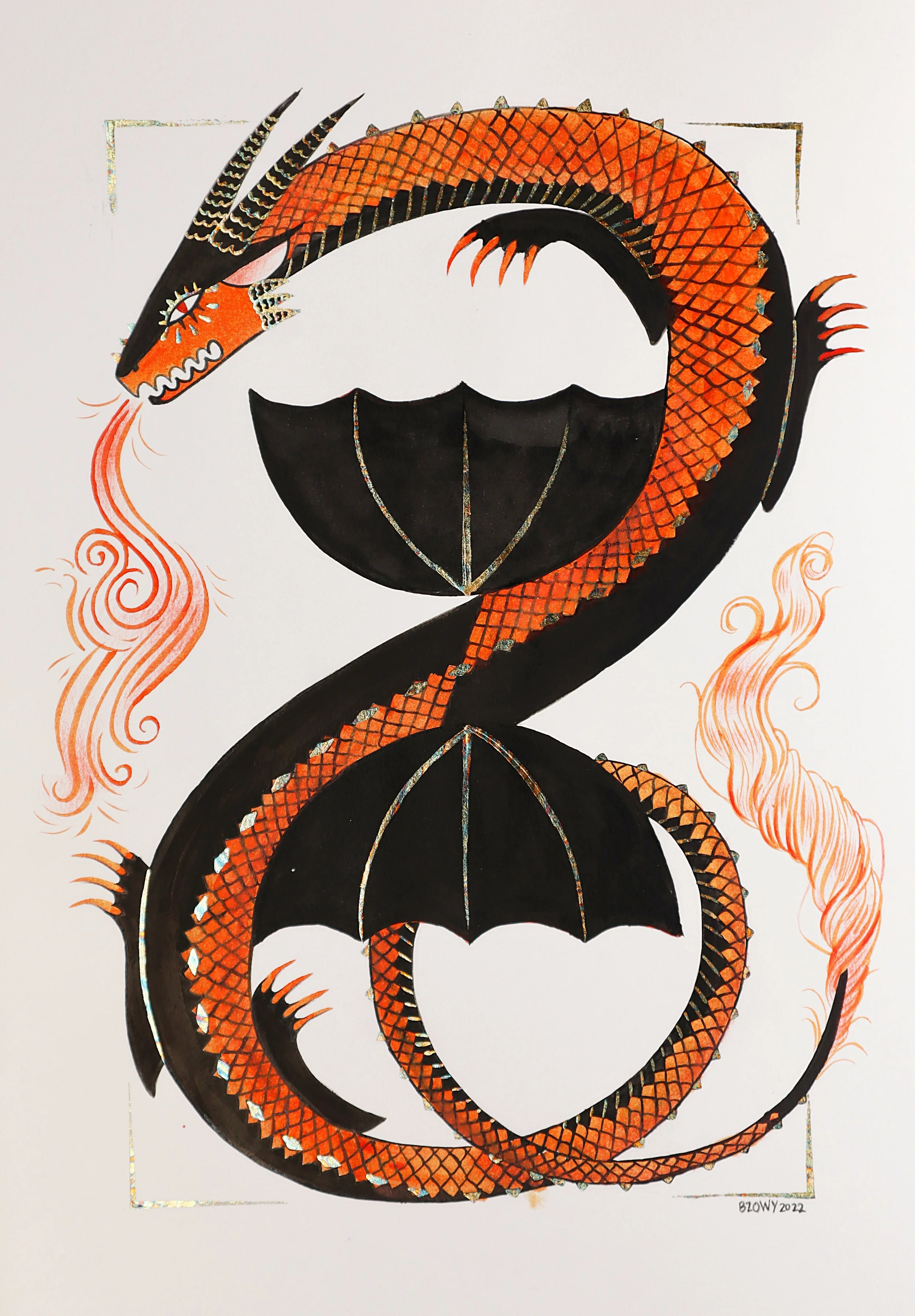 Smok Wawelski, 2022, ink, acrylic, pencil and gold leaf on paper, 42 x 29.7cm