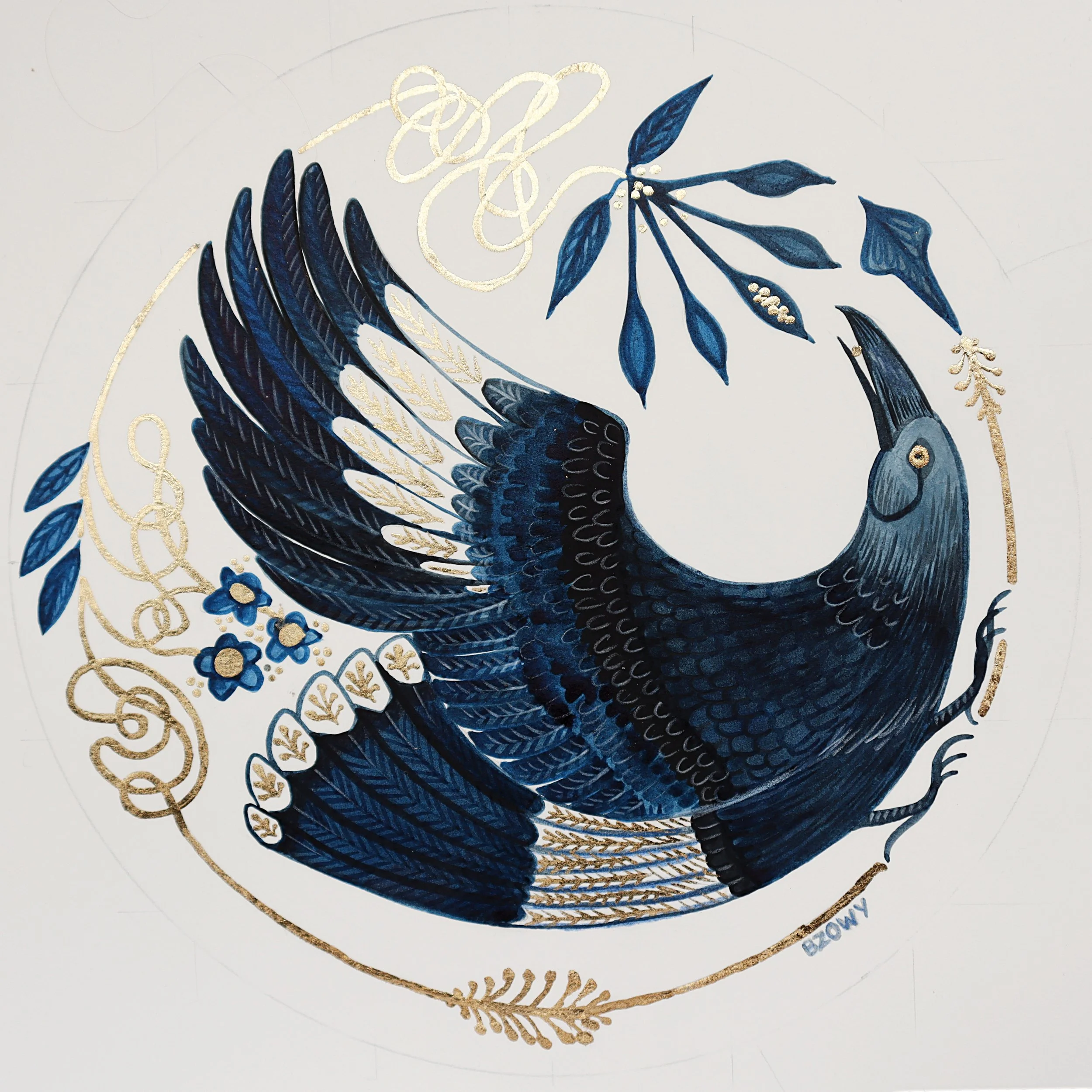 One of my current interests is in my Polish heritage. I’ve been enjoying creating folk designs referring to the styles of wycinanki (paper cutting) and pisanki (painted Easter eggs) in particular. Having grown up drawing animals and mythical creatures frequently, I am enjoying the process of bringing them to life alongside swirling botanicals and symbols. I use inks, acrylic, gouache, watercolour, pencil and shimmering leaf to play with the flourishing ornamental qualities of Polish folk art, while bringing my own style and love of natural forms to it. This is a project I enjoy working on between more conceptually driven work and is a relaxing process that is fun and, I feel, connects me to my ancestry.