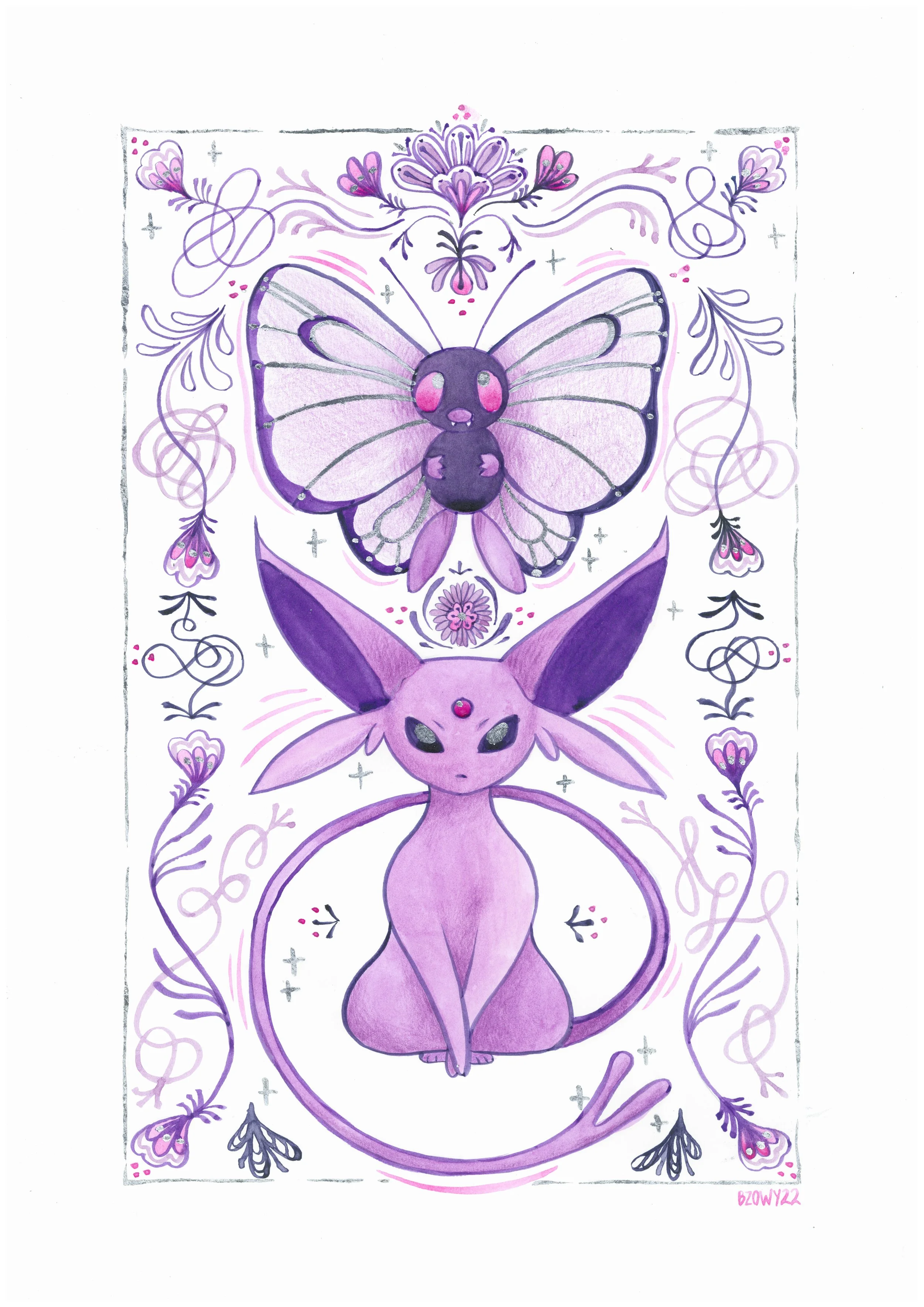 Butterfree & Espeon, 2022, ink, pencil and silver leaf on watercolour paper, 42 x 29.7cm (N/A)